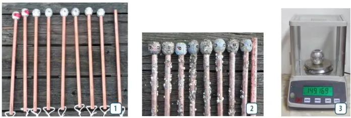 The anodes were cleaned, weighed, and installed on 2-foot lengths of 3/4-inch, copper pipe (type M), which were also weighed. We hung the samples between slips in the mid-Chesapeake Bay near Rockhold Creek for one year, cleaning quarterly to mimic light use. At the end of the test period, the samples were cleaned with a plastic scraper and scrub brush, and their interiors were scrubbed with a snugly fitted multi-knotted rope. Testers gave them a light acid cleaning to loosen barnacle residue and scrubbed them again before weighing them. We also measured potential driving force and current for each anode before and after exposure. Salinity at the test site varied from brackish to seawater salty. We will be testing in full-strength salt water for a followup article.