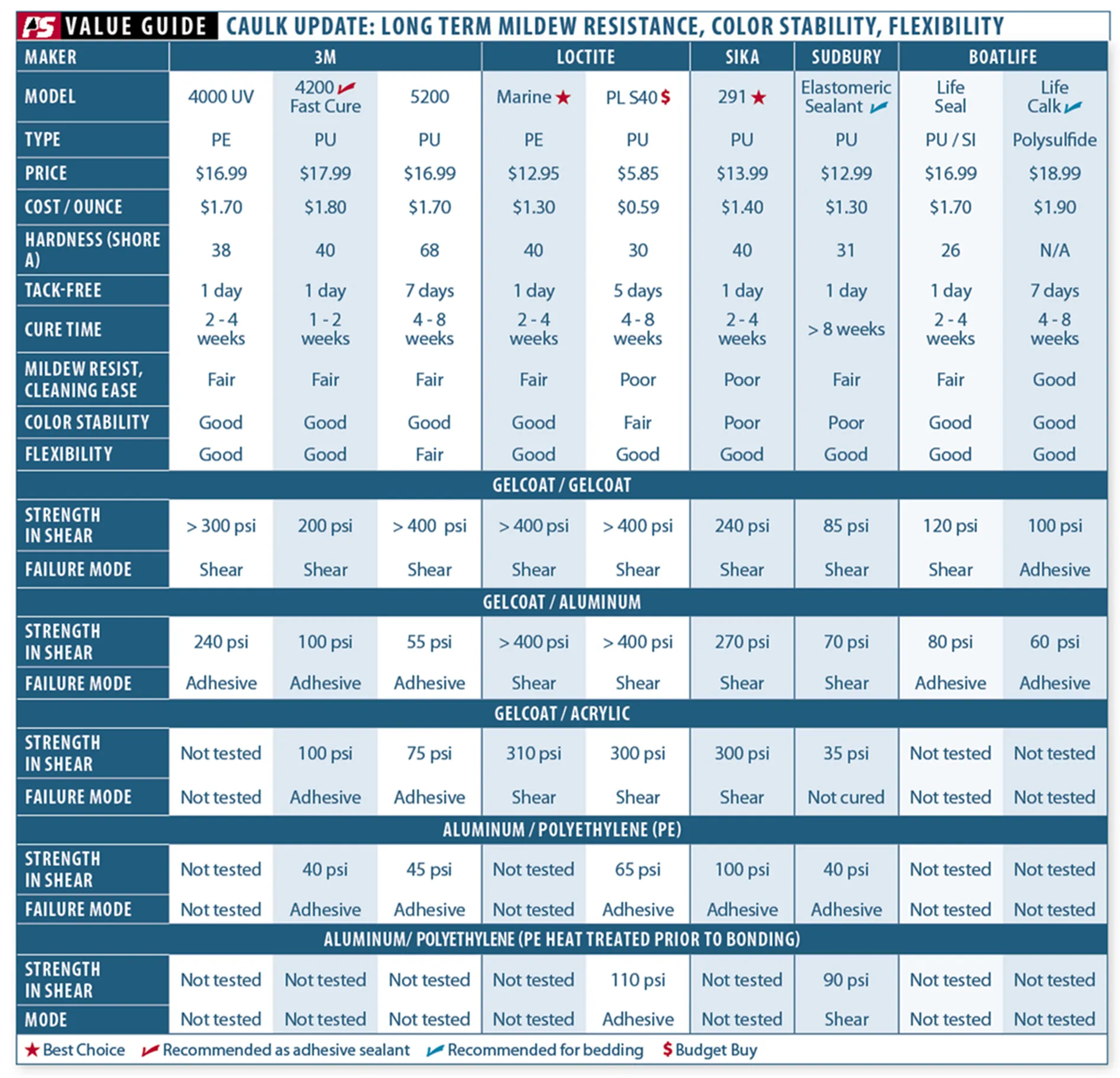 In our reporting 3M 4200 Fast Cure showed good flexibility, adhesion, and superior weather resistance, but inconsistent bonding to aluminum and plastics during shear testing. 3M 4000 UV is comparable to Loctite Marine and recommended for applications exposed to weathering. (3M 5200 is not recommended for most DIY jobs due to its stiffness and lack of flexibility and difficult-to-remove adhesion.)