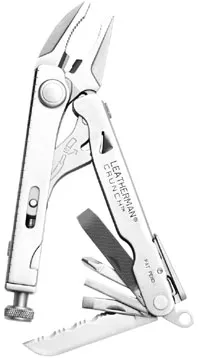 Leatherman Crunch. This company’s only model with locking-pliers, the Crunch can clamp up to a 1″-diameter pipe. Its design allows the plier jaws to fold into one handle, making a package about 4″ long and weighing 6 ounces. The pliers-dominant configuration limits the total tool complement and relegates the folding blades (all of which lock) to one handle, but provides a ¼” hex-bit holder on the locking side (first remove the jaw-tensioning bolt), and a wire stripper in the jaw linkage.