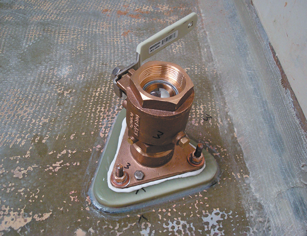 I applied bedding com-pound (3M 4200 adhesive sealant) to one bolt and inserted it from the outside of the boat; the 4200 held the bolt in place. Inside, I gooped up the flange base, making sure to fully encircle each bolt hole with sealant, and positioned it in place. I went back outside the hull, gooped up the remaining two bolts and inserted them through the holes.