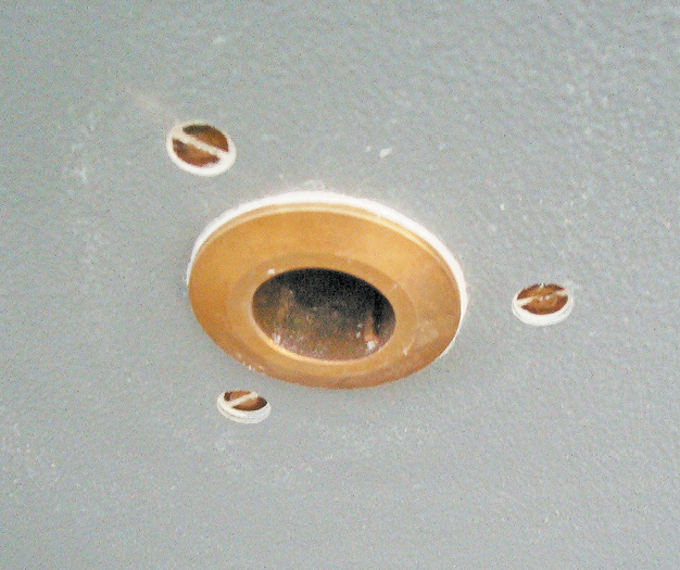Next, I lightly sanded and probed on the outside of the hull adjacent to the hole to locate the heads of three bronze flat-head fastener bolts, buried under putty and bottom paint. These bolts passed through the hull, backing plate and into holes in the flange base of the seacock located on the inside of the boat’s hull where they are secured by nuts.