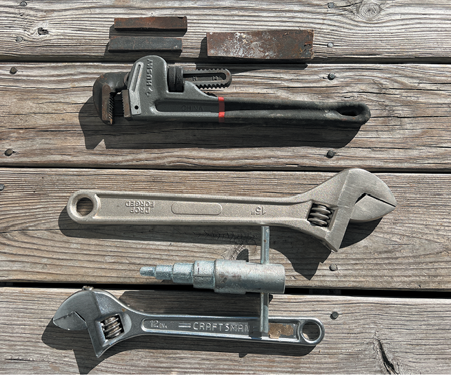 I inserted my DIY step tool into the through-hull and turned counterclockwise until it engaged with two tabs that prevented it from spinning further. I then gripped the flat bar with a large pipe wrench and unscrewed the through-hull from the seacock. If your seacock is not fixed inside the hull to prevent turning, you may need someone on the inside of the boat with a wrench to carefully grip the valve body while you turn. A seized through-hull can usually be persuaded with a longer breaker bar or with a careful application of heat from a propane torch, or both. Be careful not to overheat the fitting and damage the surrounding fiberglass.