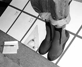 Evaluations involved testers of different sizes and weights, wearing different forms of shoes and boots. One pair of deck shoes had worn soles, and, oddly enough, this pair seemed to hold better than new shoes and boots. We used these shoes, and the same tester, to make the final evaluations shown in the chart on page 28 in the column called “Non-Skid.”