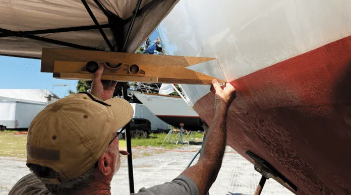 Because I wanted to have a newly painted (Awlgrip Snow White) 1-inch gap between my bottom paint and my 3-inch-wide blue (Awlgrip Aristo Blue) bootstripe, I had to perform this task twice. To measure the gap for painting, I used a 1-inch-wide plywood top indicator in the sliding jig. After marking the 1-inch gap with the sliding bevel, I taped it off, prepped, and painted. After this paint had cured, I repeated the process for the bootstripe, swapping out the 1-inch-wide top indicator for a 4-inch-wide one. To stay consistent, I kept the top of the waterline as a reference point for marking the bootstripe.