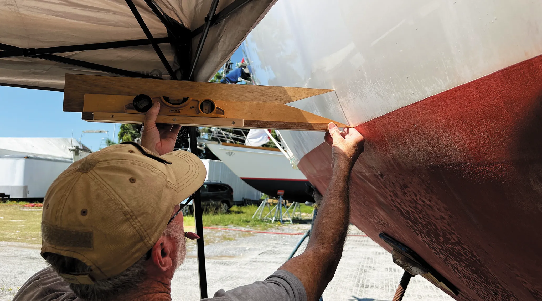 After you’ve settled on a design, you need to establish a reference point for drawing and then taping off your waterline. A level waterline makes an excellent reference point. Some owners prefer to use a laser level, which can work if the boat is dead level laterally and longitudinally and you have enough space around your boat to get a complete laser line from one end of the boat to the other.