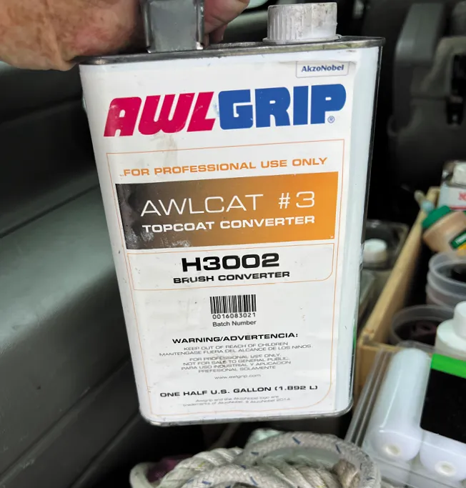 Proper prep work is essential. Before painting, I carefully dewaxed the existing Awlgrip between the tape lines using Interlux Fiberglass Surface Prep YMA 601, a pinkish gritty slurry. The YMA 601 also works on gelcoat. Be sure to follow the instructions for its use.