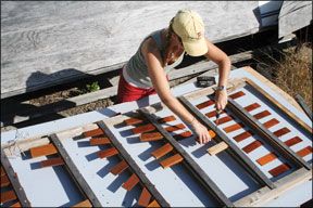 The 56 test panels were mounted on a wooden rack, and in the summer of 2008, the rack was set up at a 45-degree angle in an unobstructed area on the roof of the Practical Sailor workshop in Sarasota, Fla. The test setup ensured that all panels received the same amount of weather exposure. The top part of each panel was covered, creating a control area testers use for comparison over time. Every six months, testers disassemble the rack and rate the panels.