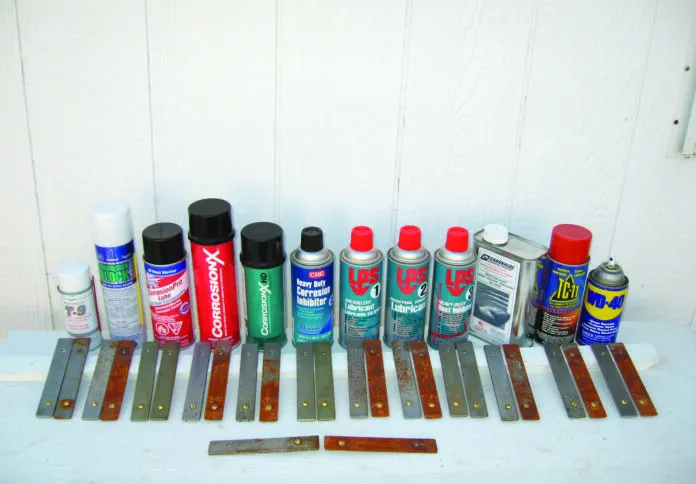 Twelve made the roster: PMS Products Boeshield T-9; LPS Laboratories LPS 1, LPS 2, and LPS 3; Corrosion Technologies Corp.s CorrosionX and CorrosionX HD; ICC Industries TC-11; Lear Chemical Research Corp.s Corrosion Block; West Marines CorrosionPro Lube; CRC Heavy Duty; Shark Hide; and WD-40, because it was already in the workshop.