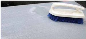 Mold and Mildew: To prevent mold and mildew, you can lightly scrub the surface with an ammonia/detergent solution. To spot clean areas that are heavily soiled or show mildew, youll likely need to step up to more aggressive cleaner. Pettit recommends its Bio-Blue 92; the blend of cleaning agents and silica grit also can be used to de-wax or etch during surface prep. Durabak recommends fighting mildew and stains with a disinfectant like Lysol, and KiwiGrip advises using bleach or a mild acid solution to remove mold and mildew stains.