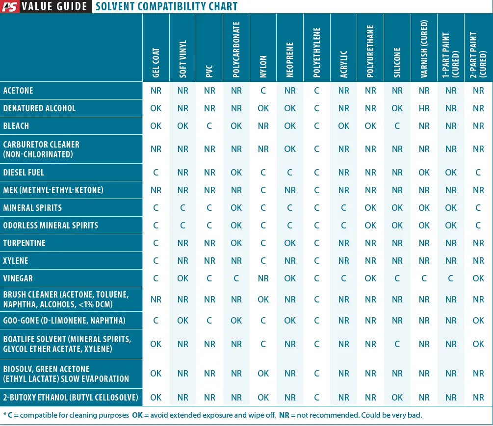 Read your MSDS and spec sheets. These disclose hazardous ingredients, basic properties, any physical hazard (flammability, burns), health hazards, and what precautions to take. Google solvent chemical computability and you can find tables of what solvents are compatible with which materials. And please feel free to drop us a line regarding any chemical, solvent, or cleaner you have questions about; we’ll get a sample and dig into it.