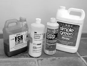 Although FSR is fairly mild, keep it off paint and varnish as much as possible, as it may dull the surface. It’s really a gelcoat cleaner. In our experience, it may take 10 minutes or more for FSR to do its thing. Then, it’s more of the ubiquitous diluted solution of Simple Green and a clean sponge to wash the acid off the surface. Rinse thoroughly with fresh water.
