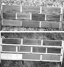 The “rack” used to test the all-stars is a matched-board frame with 10 segments. It has 1″ horizontal protective strips to provide a comparison with the original teak. Finished indoors, the rack, was placed outdoors on January 15, 2003. After exposure to sun, wind, snow and rain (and a deliberate dash of saltwater) for six months (all of them pretty rotten in terms of weather this year) it was brought in on July 15, 2003.