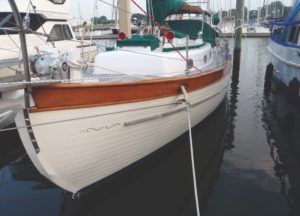 Compared to a clear, glossy varnish, it looks decent and the maintenance regimen is more realistic for our tastes and available time. However, one downside to softer, varnish alternative coatings—even those with an overcoat—is that they don’t stand up as well as hard finishes to dings and abrasion. Example: The Union’s toerail has one place in need of touching-up where a fender line wore away the finish. (See photo above.)