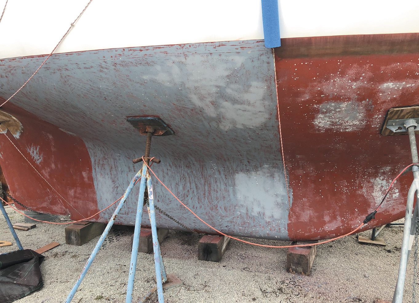 The only thing scraping failed to remove were scattered clusters of tiny spots of paint tightly bonded to the barrier coat. All of this was removed later by sanding with a random orbit sander (see “Random Orbital Sanders for Bottom Paint Prep,” PS February 2024.)