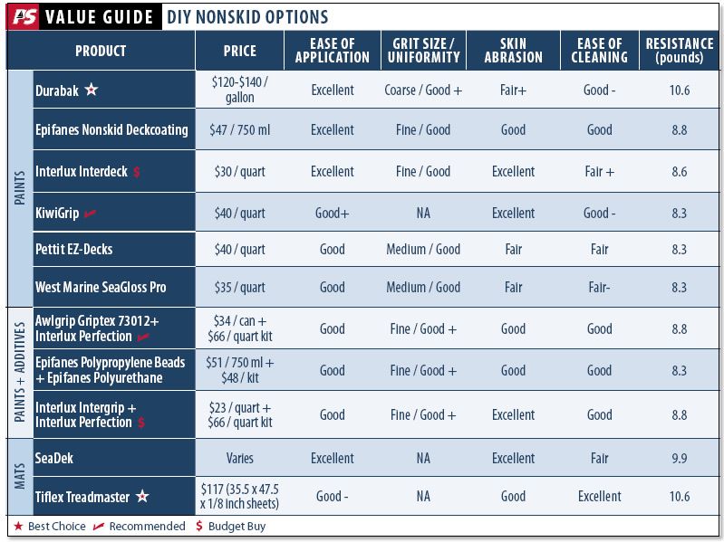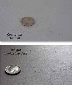Boat owners who want the ability to customize their nonskid application and want to choose their own deck paint would do well with the Awlgrip additive; choose the grit thats right for your application. The Budget Buy Intergrip additive offers a good compromise between grip and skin abrasion. In instances where a company sells a pre-mixed paint and a nonskid additive using the same media, as Epifanes does, wed likely use both products, applying the paint and sifting extra aggregate over it. This would likely save money and time in the long run.