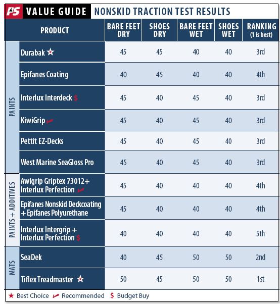 The top three finishers in the traction test were the Tiflex Treadmaster, Durabak, and SeaDek, followed by Epifanes Nonskid Deckcoating, Interlux Interdeck, and the Awlgrip Griptex additive. The two mats and West Marines SeaGloss Pro, Interdeck, and Pettit EZ-Decks offered the best grip when the surfaces were wet.