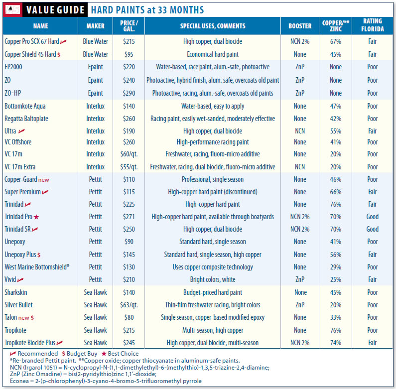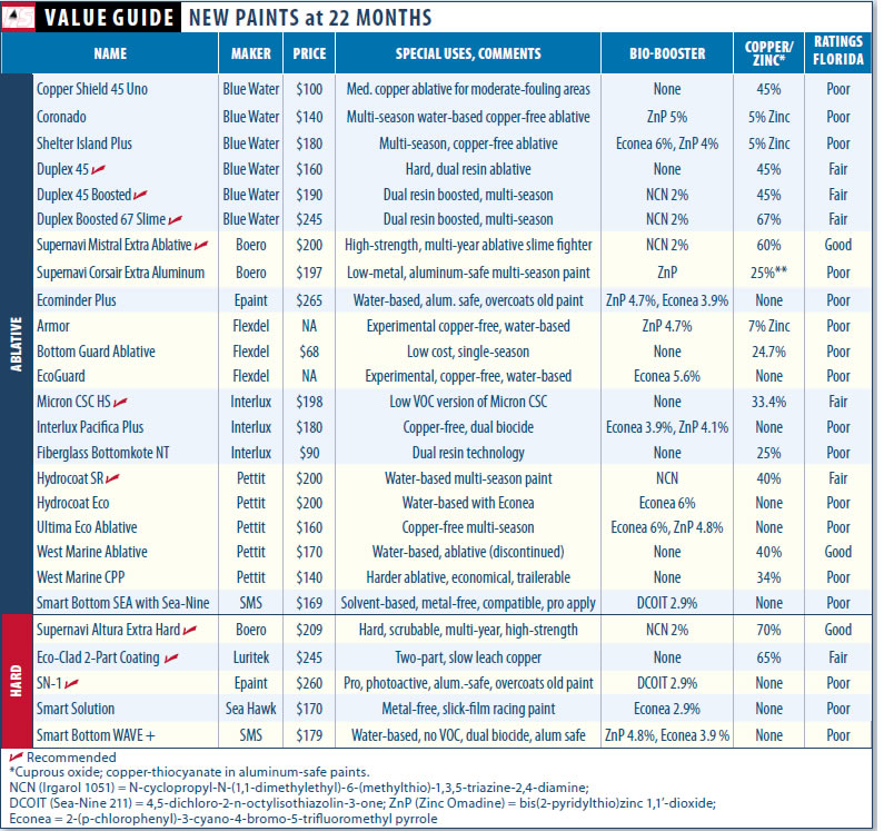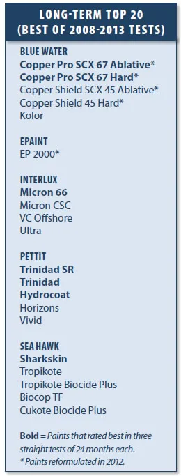 Some of the paints on the Top 20 list serve specialized purposes, so cross-reference them with the tables to ensure your choice matches your needs. Note that Epaints EP 2000 and Blue Waters Copper Pro and Copper Shield lines have new formulas, which we have tested only once to the 22-month mark. (See table on right.) Also note that the two least expensive paints on this list, Sea Hawk Sharkskin and Blue Water Copper Shied 45 Hard, usually showed more soft growth than the more expensive paints from their respective makers.