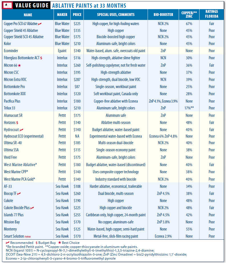 Most of Interluxs ablative paints are controlled release, so once the paint is in the water, the clock is ticking. While you can sometimes squeeze another year out of a copper-laden hard paint with more frequently cleaning, trying this with an ablative paint accelerates wear. All but one of Interluxs best ablatives were goners by 33 months, and this was not unexpected. The lone wolf still standing was Micron 66, a paint weve put to the trial on several boats and in several locales, and it has consistently done well. The downside of Micron 66 is that it will not work in fresh water. If you are looking for a budget ablative, Fiberglass Bottomkote ACT was near the top at the 26-month mark. In the hard-paint category, the Irgarol-boosted Ultra has proven again that it can go the distance. In a less fertile environment, you might be able to stretch another month or two out of it with regular cleaning, but its antifouling abilities against slime were sorely diminished at 33 months.