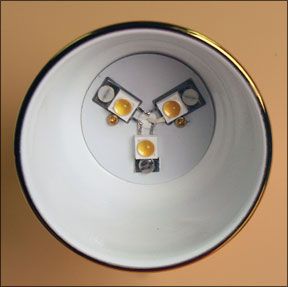 Alpenglow does not sell a separate bulb, so Practical Sailor tested its new reading light, with three LEDs built into the back of the white reflector. The fixture produced a bright uniform light that was excellent for reading our chart. Alpenglow drives its 3-watt LEDs at about 1.3 watts, and the brass housing works as a heat sink. According to Alpenglow, this lower temperature helps improve efficiency and longevity.