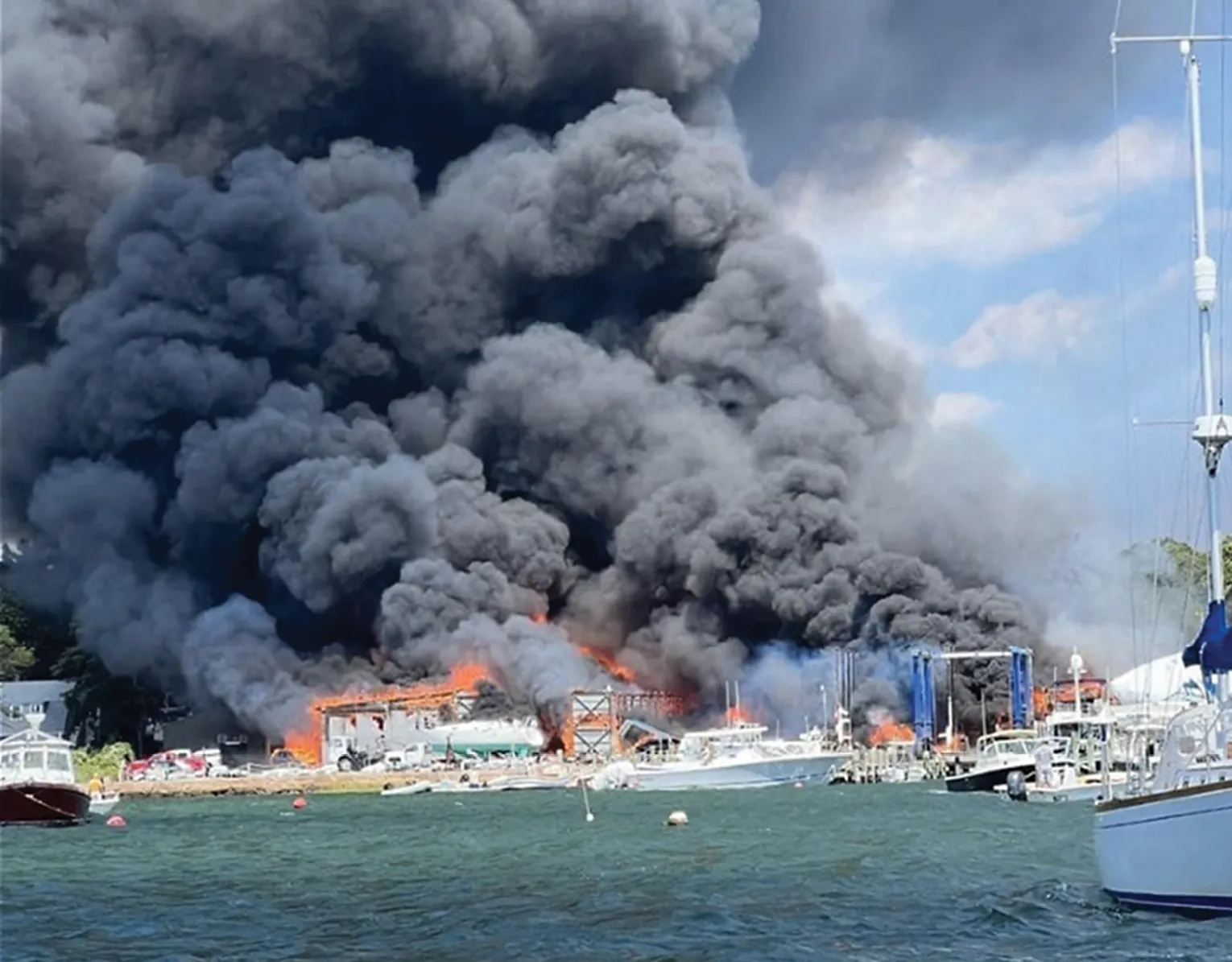At the Mattapoisett Boatyard, on August 19, 2022, an explosion and fire broke out in a boat repair building. Investigators concluded it was caused by the spark ignition of gasoline vapors in a repair building. From there the fire spread to boats that were placed tightly up against the building, and to rows of boats placed just a foot or two apart. Stands collapsed, boats piled together, and a fire storm ensued, destroying all of the structures and most of the boats. More than 100 firefighters, dozens of trucks and three fire boats responded, but little survived.