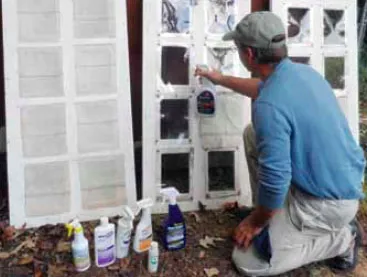 Testers secured the panels over cut-outs in painted plywood sheets, simulating a window. One panel of each product was left untreated; one panel was covered by a Sunbrella flap but not treated; and the rest were treated with protective sprays and creams. Testers kept a control set of test panels indoors.