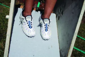 To test grip, we mounted the test panels on a jig that allowed the panels to be inclined at measured heeling angles. With a tester standing on the panel, the incline was increased in 5-degree increments until the tester slipped. We repeated the test with the panels wet and dry three times each and averaged the results. Testers wore boat shoes with medium density synthetic rubber soles, rinsed after each test. The accompanying “Nonskid Traction Test Results” table shows the average results. Most panels hit the 40-degree mark wet and dry. For more details on the application, test protocol, and rating system, check out “How We Tested” in the online version of this report.