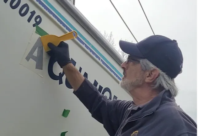 Step 6: Apply soapy water or Windex and, using a rolling motion, slowly roll down, removing the backing paper at the same time until the sign or letter is in place.