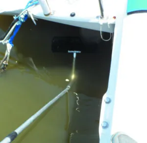 Unplug the boat and the neighboring boats. You will be reaching into the water with an aluminum pole and we have experienced a tingle before while swimming in a marina. All it takes is a boat with bad wiring. But with your feet on deck or dock, it’s obviously safer than swimming and the only safe option for in-marina use by freshwater sailors. Rubber insulating gloves and dry shoes can add grip and safety. A non-conductive hose over the handle wouldn’t be dumb.