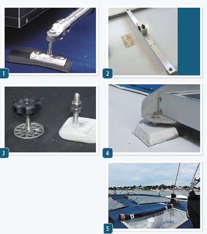 The simplest mounting method for rigid panels is directly to the deck using z-brackets, studs, or glue-on brackets. If mounting to frame above davits or a Bimini top run -inch x 2-inch aluminum bar crosswise under the panel, attach it to the factory-supplied mounting holes, and then attach with rail clamps or brackets (photos 1 & 2).