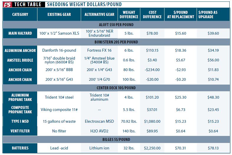Speed doesn’t matter to you? Even so, an overweight boat does not handle her best either, around the marina or in rough weather. And for every pound you save, thats another pint of your favorite brew or a favorite book you can bring without guilt. How far you take all of this depends on your priorities. Think of it as a maintenance diet for your sailing life.