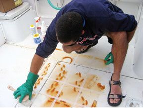 To promote staining, we placed on the cockpit sole of our test boat several fish hooks, a large crescent wrench, about 10 feet of chain, a rusty old jack stand, and a few other tools. We sprayed the items with salt water several times over the course of two weeks until we had ourselves some real nastiness. Then it was time to clean.