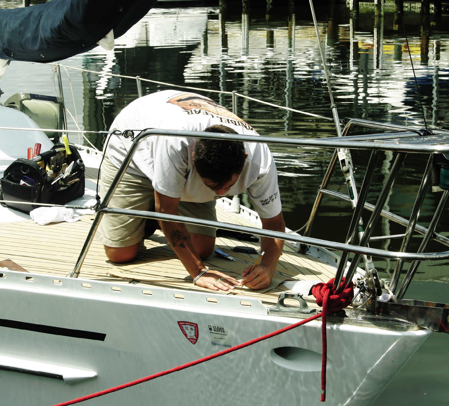 One week last year, as our beleaguered editor scraped and sanded away at the third of five layers of paint and primer (a project that would carry on for more than 30 days), he watched a two-person crew from one of the synthetic teak companies prep and re-deck a Beneteau nearly twice the length of Opal in three days—four if you include the measuring and computerized pre-cuts made before the installation.