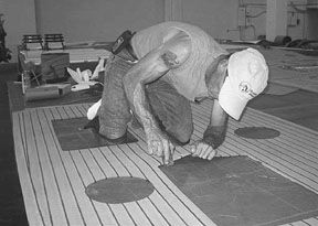 You then fill in the remaining deck area with the tongue-and groove sections. If you use a king plank, you’ll have to custom cut the sections where they meet the plank. When the entire deck is laid out,fits,joints together with a one-part cement. resulting in assembled multi-section mats. You then pick up the mats, clean the deck, mix and apply the epoxy, and replace the mats—it’s a lot like laying flooring in the home.