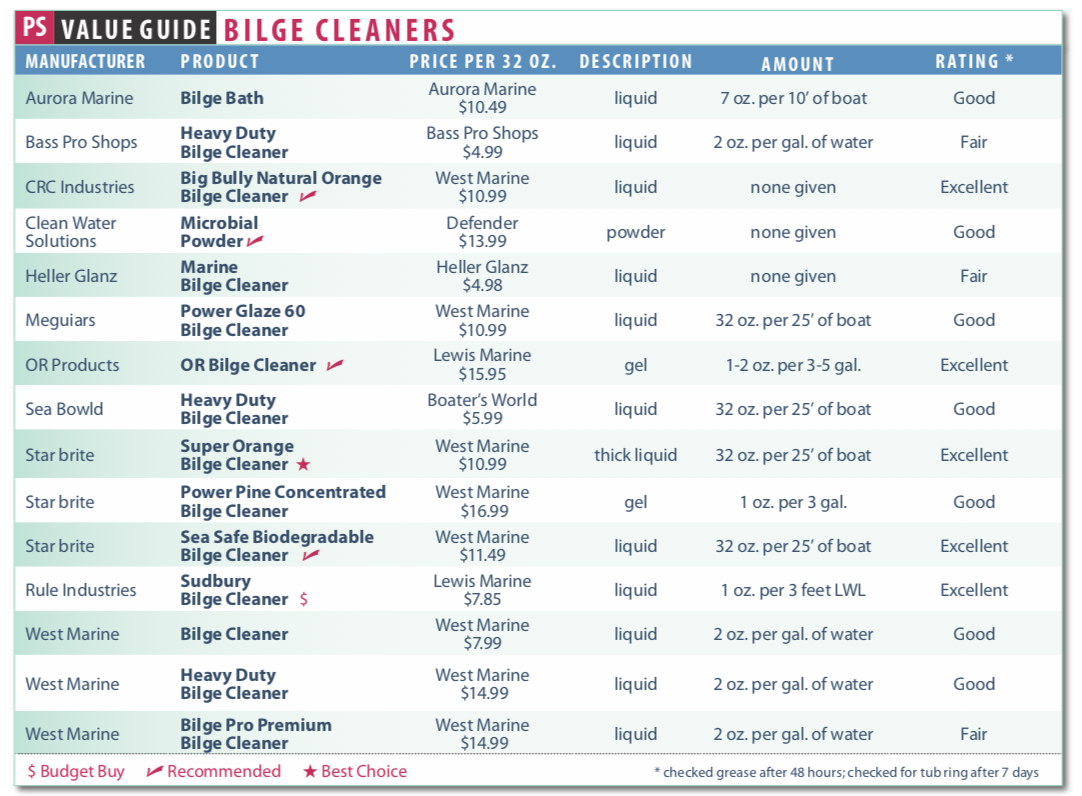 Most bilge cleaner manufacturers stipulate the amount of the product to be used, and often this is relative to boat size. Aurora Marine, for instance, recommends 7 ounces of its Bilge Bath for every 10 feet of boat length. The directions on Meguiar’s Bilge Cleaner dictate “Use 32 ounces for a 25-foot boat and proportionally more or less on smaller or larger boats.” And Bass Pro Shops’ Heavy Duty Bilge Cleaner indicates 2 ounces of cleaner for every gallon of water in the bilge. These directions are typical of the 15 products we tested, though none take into account the widely varying volume in bilges of boats the same size.