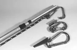 The Kong hook, a caribiner type with a spring-loaded gate, is different in that slots are crudely ground into both the hook and the gate to engage rails on the U-shaped bracket. As with the others, when the pole is withdrawn, the gate snaps closed. West Marine sells the Kong for $38.50.