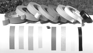 We gathered up rolls of the following products specifically manufactured for masking projects: 3M Scotch Brand blue tape No. 2090, 3M Scotch Brand No. 233+ green tape, 3M Scotch Brand No. 256 green tape, 3M Scotch Brand No. 218 Fine Line tape, Intertape ProMask Blue, Intertape ProMask Green, and Inter-tape plain Masking Tape. For good measure, we threw in a roll of black electrical tape, which can be purchased at most hardware and home stores. Why? Because a local varnishing professional, Sally Dumas, told us that she has used black electrical tape as a masking tool for years. “Using black electrical tape is my most closely guarded secret. The only tape that I use is Manco,” which she claims is available at Lowes home stores (We were unable to obtain Manco electrical tape and substituted a garden variety sold at Dollar General Stores.)