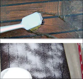 Each teak cleaner was applied to a section of weathered teak decking aboard our test boat, a 1978 Union 36 docked in the Chesapeake Bay area. The boats deck, which is exposed year-round, had been previously cleaned using a deck brush and fresh water eight months prior to the test.