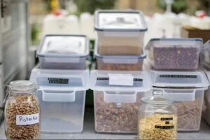 Dry foods in jars are pictured on the Topup Truck, an electric milk float converted into a zero waste shop which brings “packaging-free” to shoppers. (Photo by TOLGA AKMEN / AFP) (Photo by TOLGA AKMEN/AFP via Getty Images) - Invest in a good-quality, insulated water bottle and refill it as you go, avoiding plastic water bottles altogether. Buy a second one with a different style lid for your hot beverage of choice, and you’ll be set for drink containers for years. As you head inland for lunch or dinner at restaurants, you’ll find that almost every establishment is happy to refill your container.