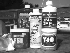 We obtained five specialized cleaners from different manufacturers at several local chandleries, choosing only those that stated they were suitable for removing waterline stains.