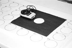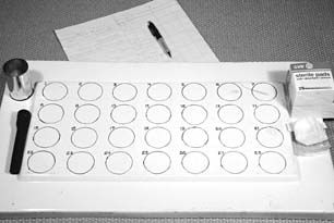 Cleaning was all that was needed with the test panel, to prepare it for the waxes. Finally, the 28 circles were defined with permanent ink.