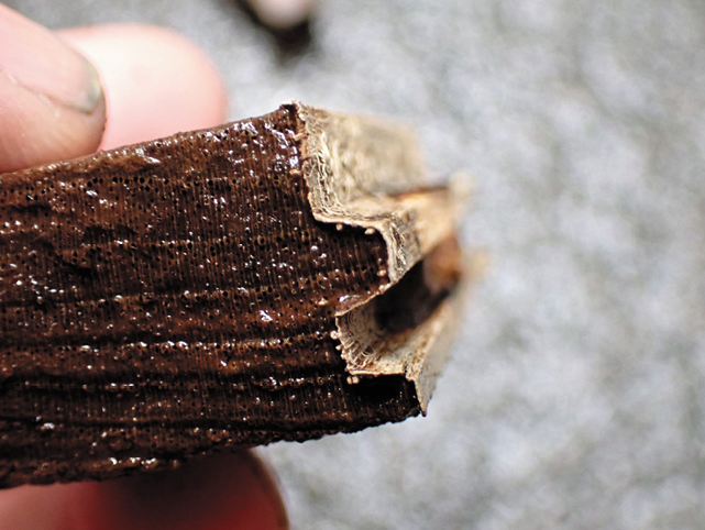 3. Fir treated with Borate (left) or glycol (right) and then sealed with epoxy was weakened about 50 percent, but was still generally sound.