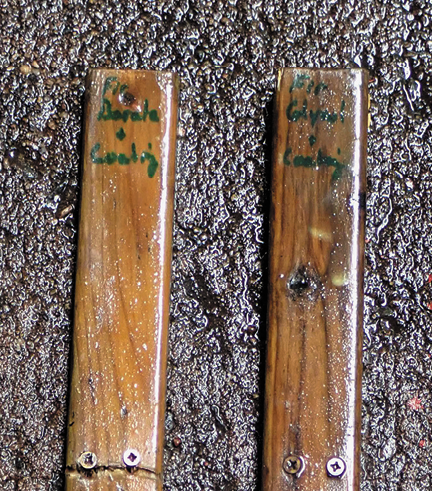 Samples that were treated with borate-glycol and then coated with epoxy or varnish did much better over the long haul. Once the anti-rot treatments have soaked in, the coating’s main function is not to keep the wood dry, but to keep the treatment from washing out.