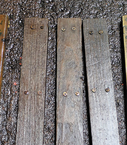 4. Pressure treated fir and fir are not in the same category. From left to right: fir treated with glycol only; pressure treated fir; pressure treated fir (from a different batch); deck tiles coated with epoxy; fir treated with glycol and varnished; untreated fir.