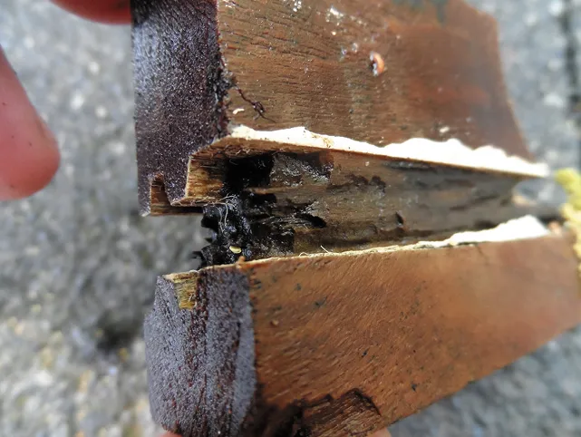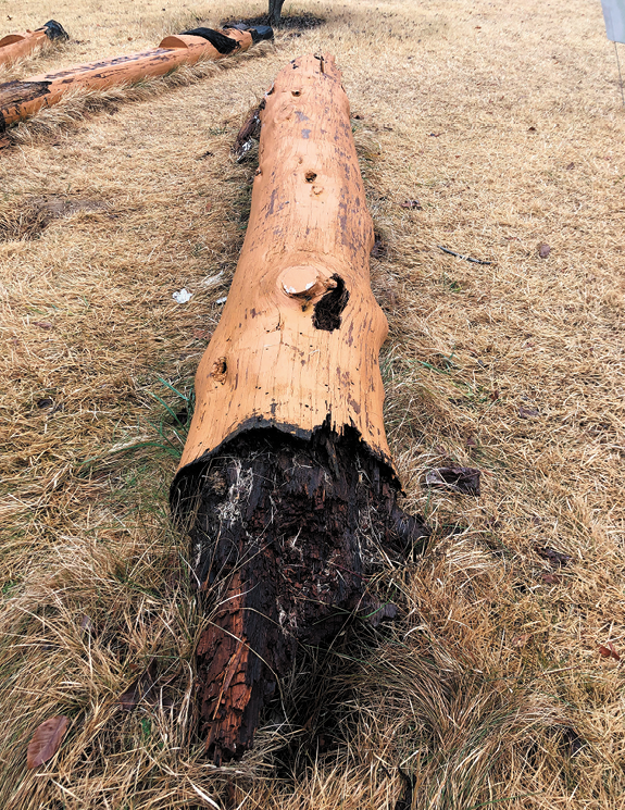 1. Untreated totems of the same age near our test location came down easily in a winter storm. The black area is rot, not fire damage.