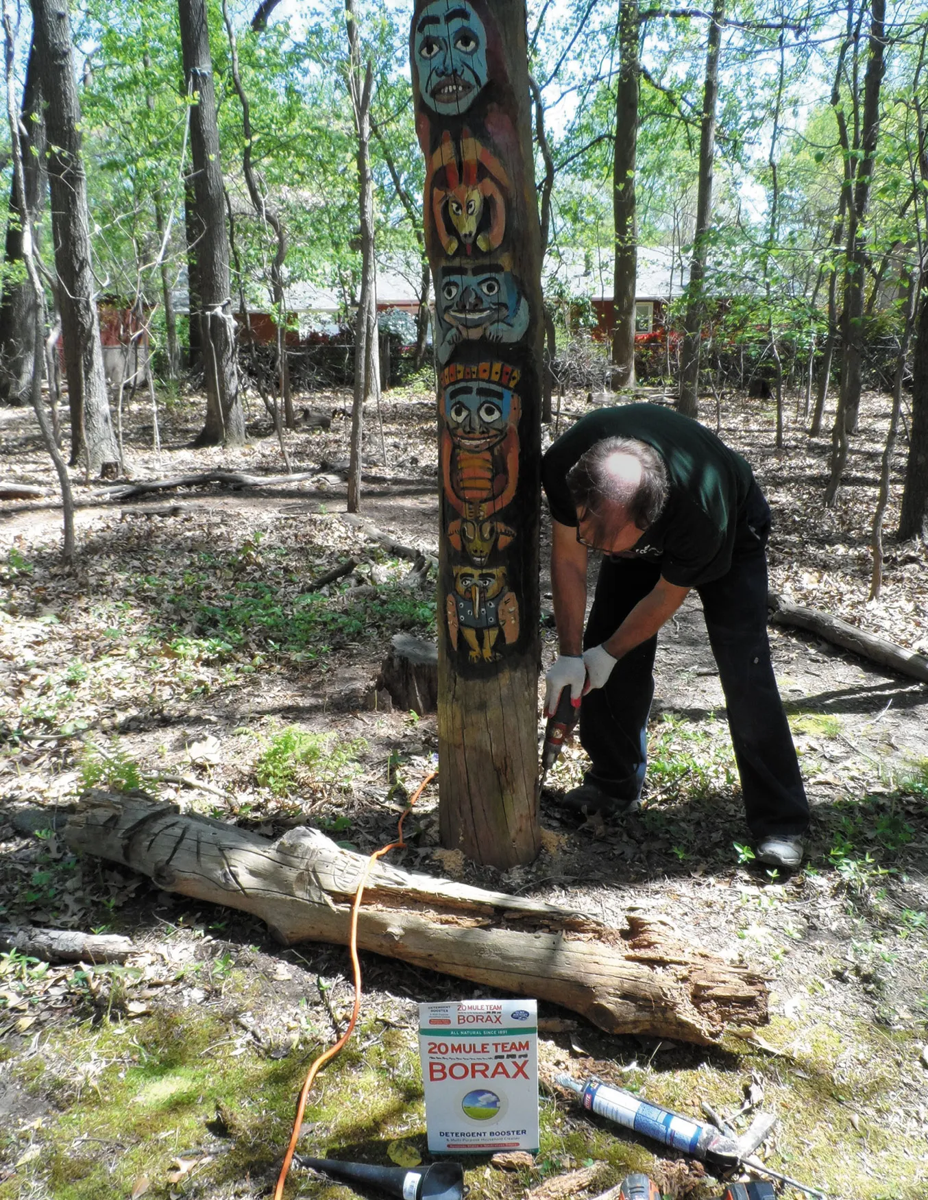 Jack Pine Totem Pole. The buried base on our jack pine totem pole is still going strong, with no noticeable rot. We renew the Borax treatment every 5 years by pouring Borax into deep holes drilled at an angle, down into the base. This method is commonly used by power companies to protect older power poles that were creosote treated. While our test was ongoing, some similar, slightly younger totem poles carved from local pine and installed at a nearby botanical garden park fell over in a storm; their bases had rotted out.