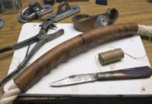 Our approach to chafe protection for the upcoming storm season was straight out of the old-salt playbook. Using a sharp knife and metal straight edge, we lopped off the size of leather we needed. Holes were punched opposite each other at 1/2-inch intervals, and for temporary use, we zigzagged small cord the length of the leather. For a more permanent installation, we hand-stitched the leather in place, tucking locking stitches into the rope at each end. Holes were made with a pliers-like hole punch, and we fashioned our chafe strips to be long enough to cover the hard points, adding an additional 25 percent to the length to handle stretch and any minor slippage.