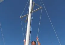 Mast steps are a great help when going aloft, but they add weight where it hurts most (aloft), and halyards love to get stuck behind them. One alternative is the Mast Mate webbing ladder, which hoists on your mainsail track.