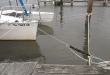 Securing a small boat between pilings in a wrong-sized slip is a common challenge. The dock line angles from the dolphins (outlying pilings) are too narrow for a beam wind, allowing the boat to dance around, increasing forces, chafe, and even making it difficult to stand in the cockpit. During a recent winter near-gale we measured dockline forces on several smaller boats that reached four times higher than the static wind load. If the recommended size dockline was used, the rope would be operating beyond its working load limit in real storms and could fail. Increasing the line diameter would result in more jerking and chafe.