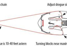 For maximum maneuverability, the control lines-one port, one starboard-should attach at the widest part of the boat. This maximizes leverage and places the effort close to the center pivot point. On a catamaran, closer to the transom works because of the wide beam, but for monohulls, attaching near the pivot point at the keel will be more responsive. For maximum responsiveness, the drogue should be as close to the transom as practical-this results in more responsive steering and minimal drag. We found the best compromise to be around 65-80 percent of the way aft, where there is still enough beam, but less risk of the control lines fouling.