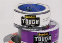 The new line, Scotch Tough Duct Tapes, includes: a new No Residue tape, said to handle temps up to 200 degrees, that can be left on for up to six months without leaving a sticky mess behind; an Extreme Hold tape, which uses a double-layer adhesive for a better grip that wont fail under pressure; a Heavy-duty All-Weather tape designed for long-term (even permanent) exterior repairs that 3M claims will stand up to UV and moisture without cracking or peeling; and Outdoor Painters Clean Removal tape, which is marketed as a paint pros choice for high adhesion, waterproof backing, and clean removal for up to two weeks. The line also touts the first-ever transparent duct tape for "invisible" repairs.